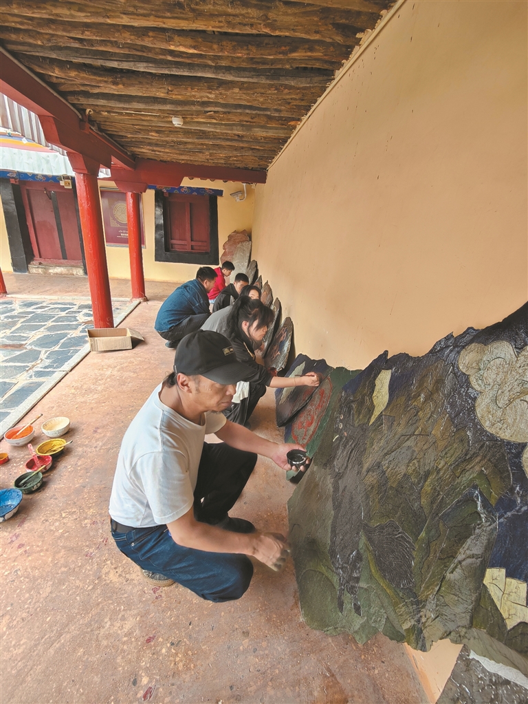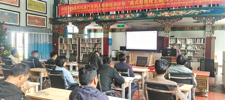 加措在“藏式彩绘技艺助力乡村振兴技能研修班”中为学员讲解传统藏式木雕和彩绘技艺。